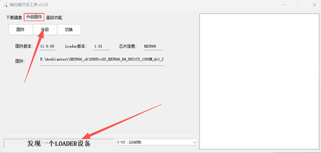 打开升级工具,显示如下图表示已经连接设备,如果连接不上可以更换Usb口测试,再不行就需要清空EMMC才可以。