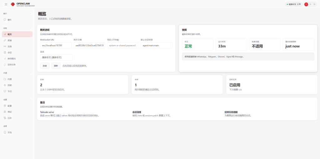 打开仪表板:openclaw dashboard